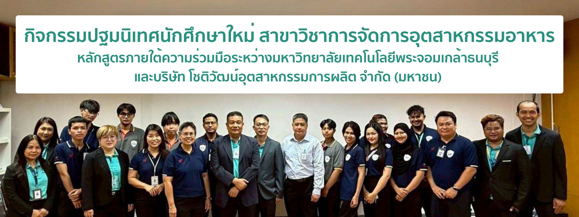 กิจกรรมปฐมนิเทศนักศึกษาใหม่ในสาขาวิชาการจัดการอุตสาหกรรมอาหาร โดยเป็นหลักสูตรภายใต้ความร่วมมือระหว่างมหาวิทยาลัยเทคโนโลยีพระจอมเกล้าธนบุรี และบริษัท โชติวัฒน์อุตสาหกรรมการผลิต จำกัด (มหาชน)